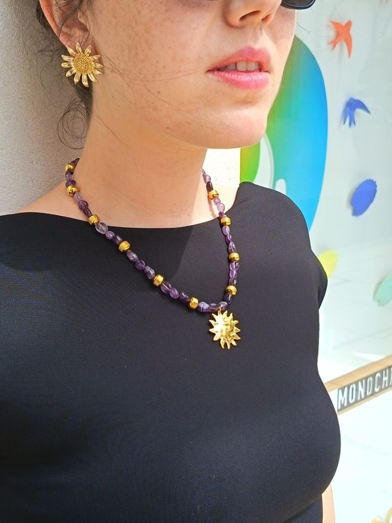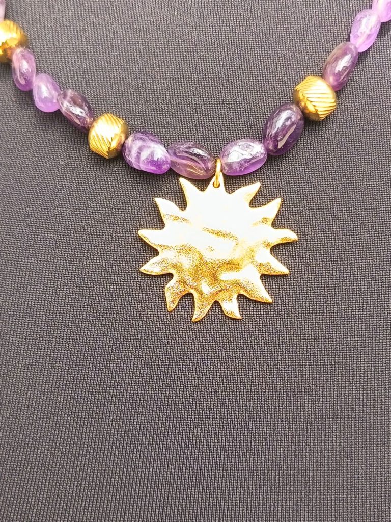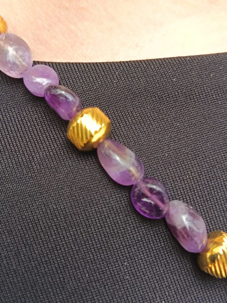 Aujourd’hui je vous présente le collier Sérénité, il est agrémenté d’améthystes. L’améthyste, c’est la pierre du calme absolu. En lithotherapie, cette pierre est celle de la tempérance et de la sagesse.